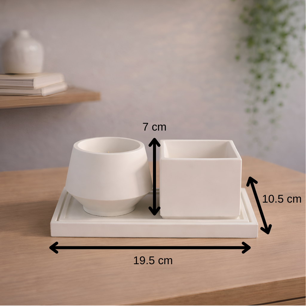 Bud Sukulent Beton Saksı – 2'li, iki farklı formda beton saksı ve uyumlu tepsisinden oluşan modern bir settir. Yuvarlak ve köşeli formların bir araya gelişi, sade ama karakterli bir kompozisyon yaratır. Mat ve nötr yüzeyi sayesinde modern, minimal ve doğal iç mekânlara kolayca uyum sağlar. Farklı bitki türlerini birlikte kullanmak ya da biri bitki, biri dekoratif obje olarak değerlendirmek için idealdir. Tepsi, seti tek parça gibi algılanır hale getirirken yüzeyi korumaya da yardımcı olur.