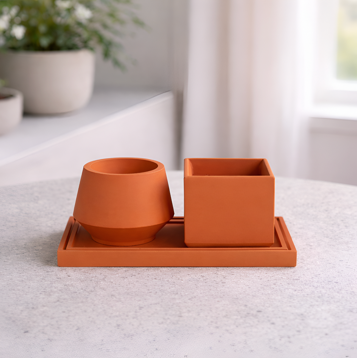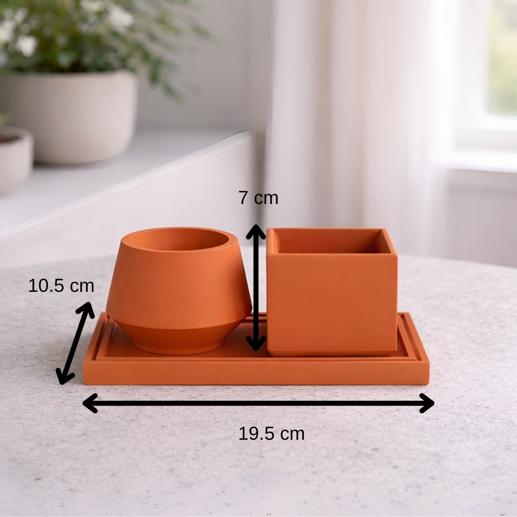 Bud Sukulent Beton Saksı – 2'li | Terracotta, iki farklı formda beton saksı ve uyumlu tepsisinden oluşan, sıcak ama modern bir settir. Yuvarlak ve köşeli formların bir araya gelişi, terracotta rengin doğal karakteriyle birleşerek mekâna samimi ve dengeli bir görünüm kazandırır. Mat terracotta tonu, betonun güçlü yapısını yumuşatarak doğal ve zamansız bir estetik sunar. Set, sehpa, konsol veya pencere önü kullanımı için idealdir. Tepsi, hem görsel bütünlük sağlar hem de yüzeyi korumaya yardımcı olur.