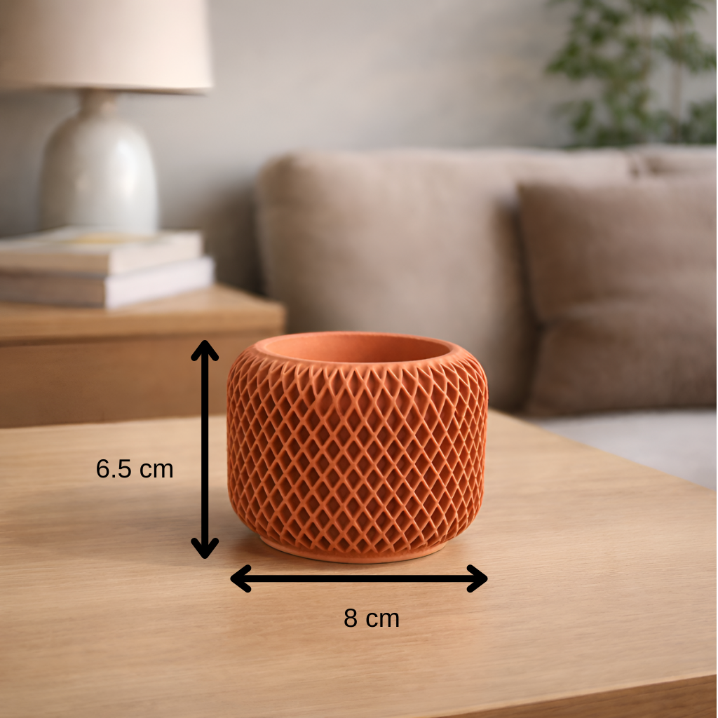 Facet Grid Sukulent Beton Saksı | Terracotta, ritmik geometrik yüzeyi ve doğal terracotta rengiyle modern dekorasyona sıcak bir karakter kazandırır. Dokulu yüzeyi ışıkla birlikte derinlik hissi yaratırken, sade formu sayesinde bitkiyi ön planda tutar. El yapımı beton yapısı her ürünü benzersiz kılar. Tek başına dekoratif bir obje olarak güçlü bir duruş sergiler; farklı renk ve formlarla birlikte kullanıldığında dengeli bir kompozisyon oluşturur.