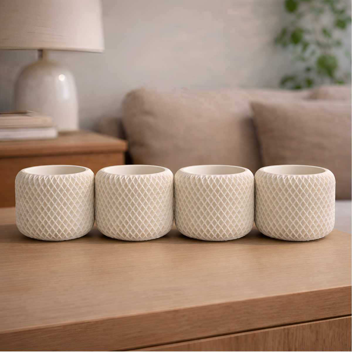 Facet Grid Sukulent Beton Saksı – 4'lü, geometrik Facet Grid yüzeyine sahip dört adet beton saksıdan oluşur. Tekrarlayan dokusu sayesinde mekânda güçlü, düzenli ve mimari bir kompozisyon yaratır. Mat ve nötr yüzeyi, modern ve minimal iç mekânlarla kusursuz uyum sağlar. Dörtlü kullanım, geniş sehpa, konsol veya raflarda dengeli bir düzen oluşturur; bitkileri ön plana çıkarırken mekâna sakin ama etkili bir karakter kazandırır. El yapımı beton üretimi sayesinde her saksı kendine özgü küçük doku ve ton farklılıkları taşır.