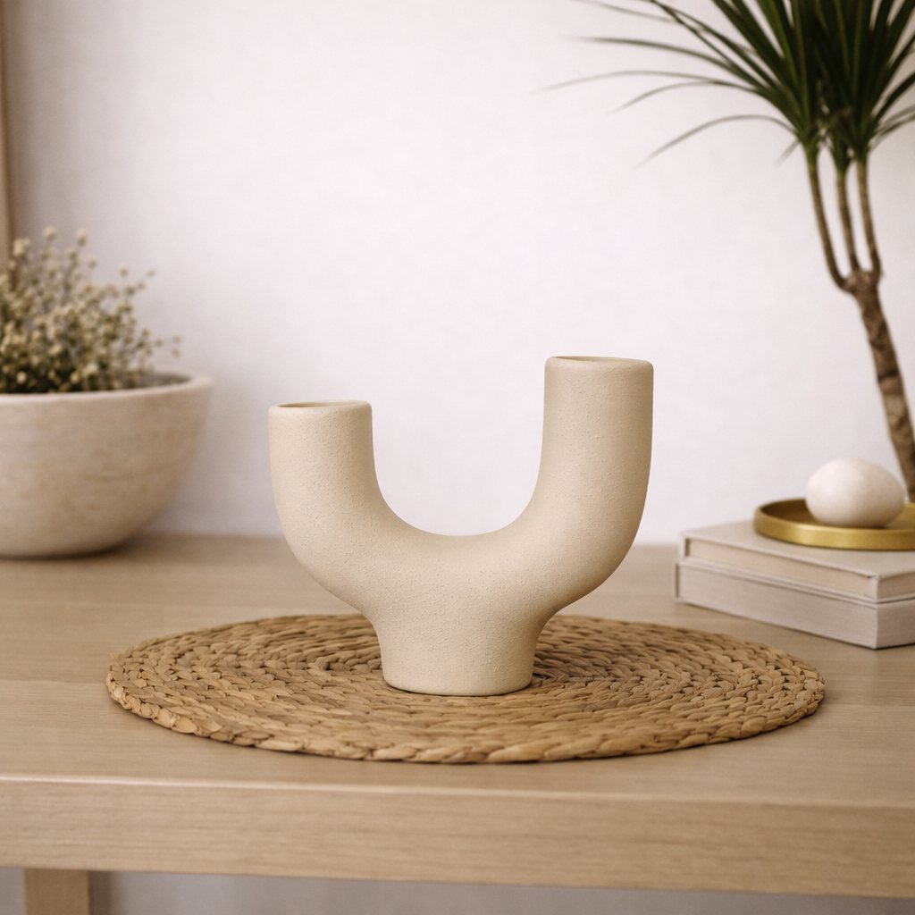 Yara Seramik Vazo, çift ağızlı ve akıcı formu ile modern dekorasyona özgün bir yorum getirir. Dengeli yapısı ve yumuşak kıvrımları sayesinde mekânda sade ama dikkat çekici bir duruş sergiler. Doğal beyaz tonu ve mat yüzeyi, vazoya zamansız ve ferah bir karakter kazandırır. El yapımı dokusu her ürünü benzersiz kılar. İki ayrı ağız yapısı sayesinde kuru çiçekler, tek dal çiçekler veya dekoratif dallarla yaratıcı düzenlemeler yapılabilir. Konsol, sehpa ve raf dekorasyonlarında modern ve doğal bir atmosfer yaratmak isteyenler için ideal bir parçadır.